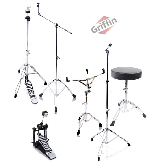 Drum Hardware Pack Complete 6 Piece Set by GRIFFIN - Full Size Percussion Stand Kit with Snare, Hi-Hat, Cymbal Boom, Throne Stool & Single Kick Pedal