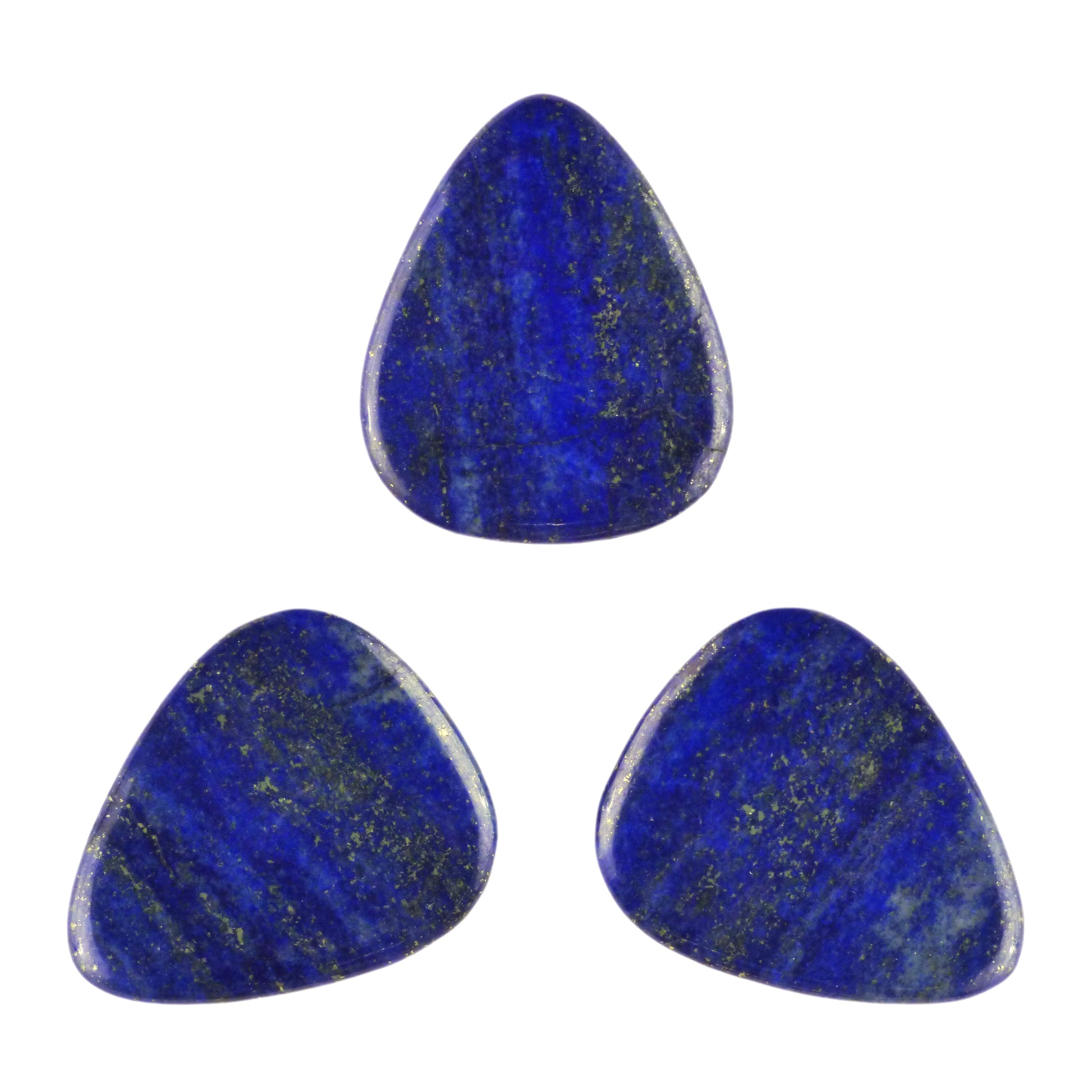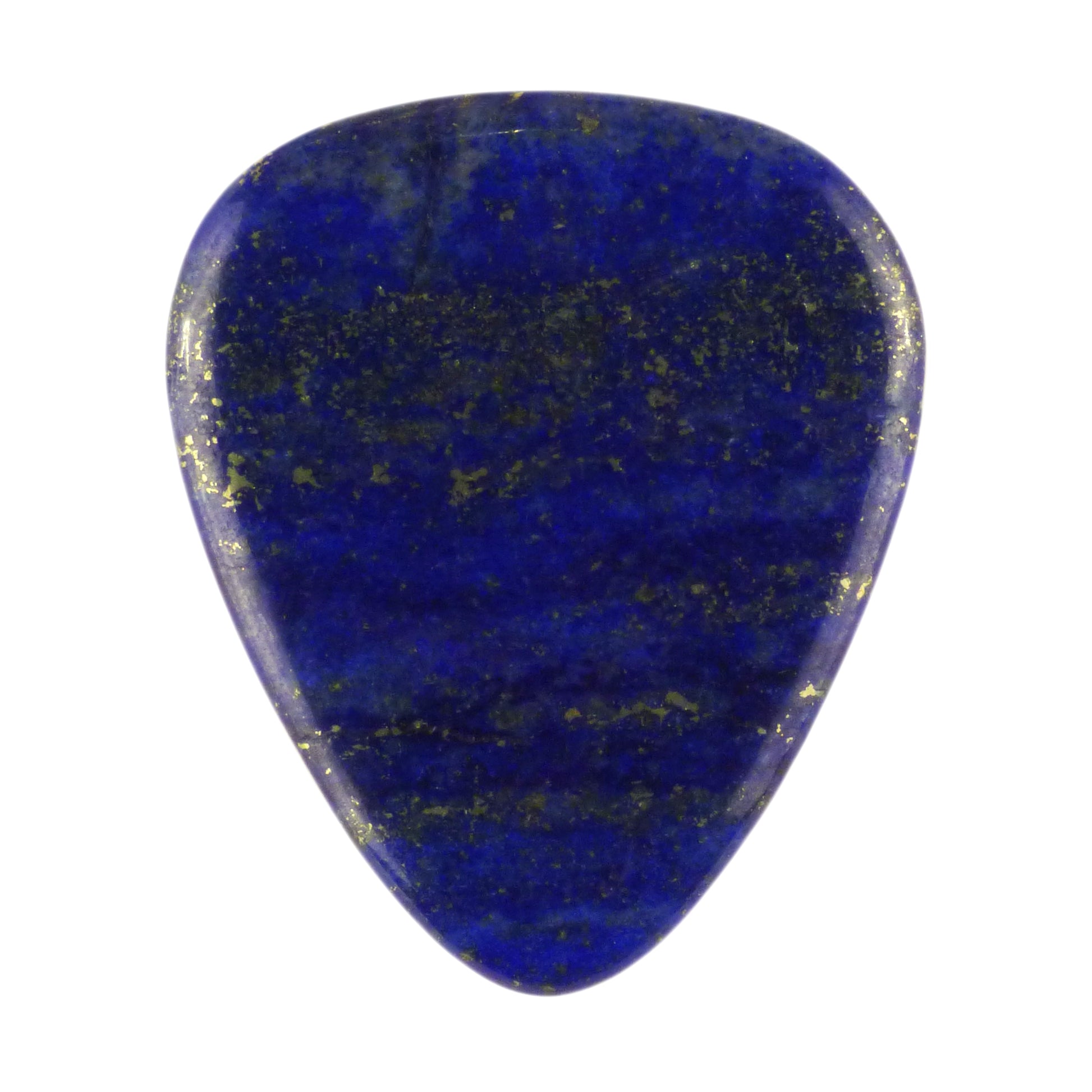 Plectrums made from stone have been used traditionally throughout the world since the dawn of stringed instruments millennia ago. Lapis Lazuli is a metamorphic rock typically composed primarily of lazurite, calcite, sodalite, and pyrite (Fools Gold), with some other trace minerals usually present. Lapis Lazuli is known for its deep blue color and features pyrite inclusions that give it a golden glittery appearance.