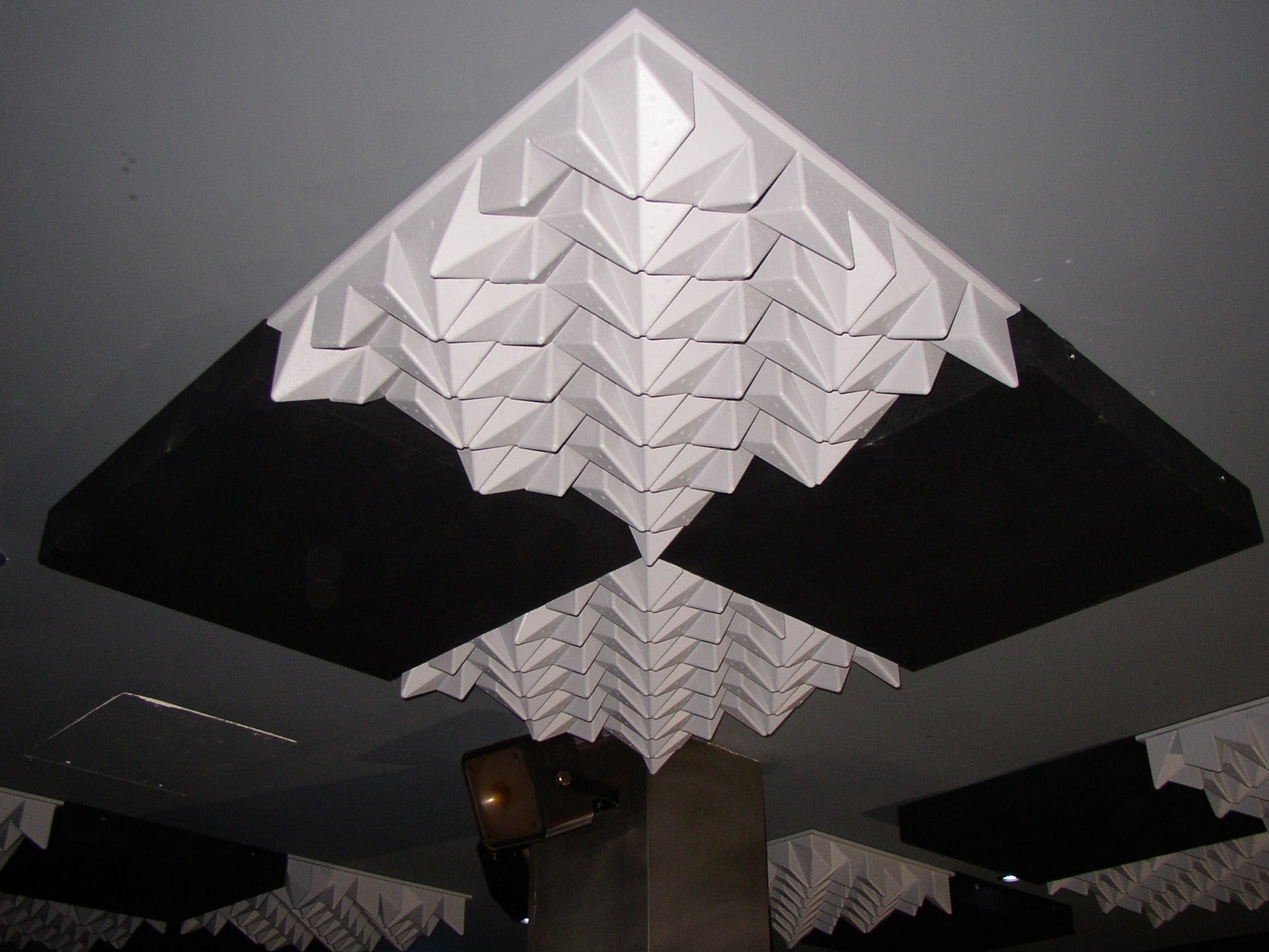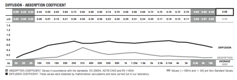 The calculation basis was the theoretical numerical sequence ratio of the primitive root, thus providing excellent results of sound diffusion in all directions. The depth factor is logarithmically varied, and it is, therefore, a three-dimension omnidirectional reflection panel. Due to its quite sinuous shape with deep recesses, as well as the raw material it is made of, this product also has a considerable associated absorption coefficient.